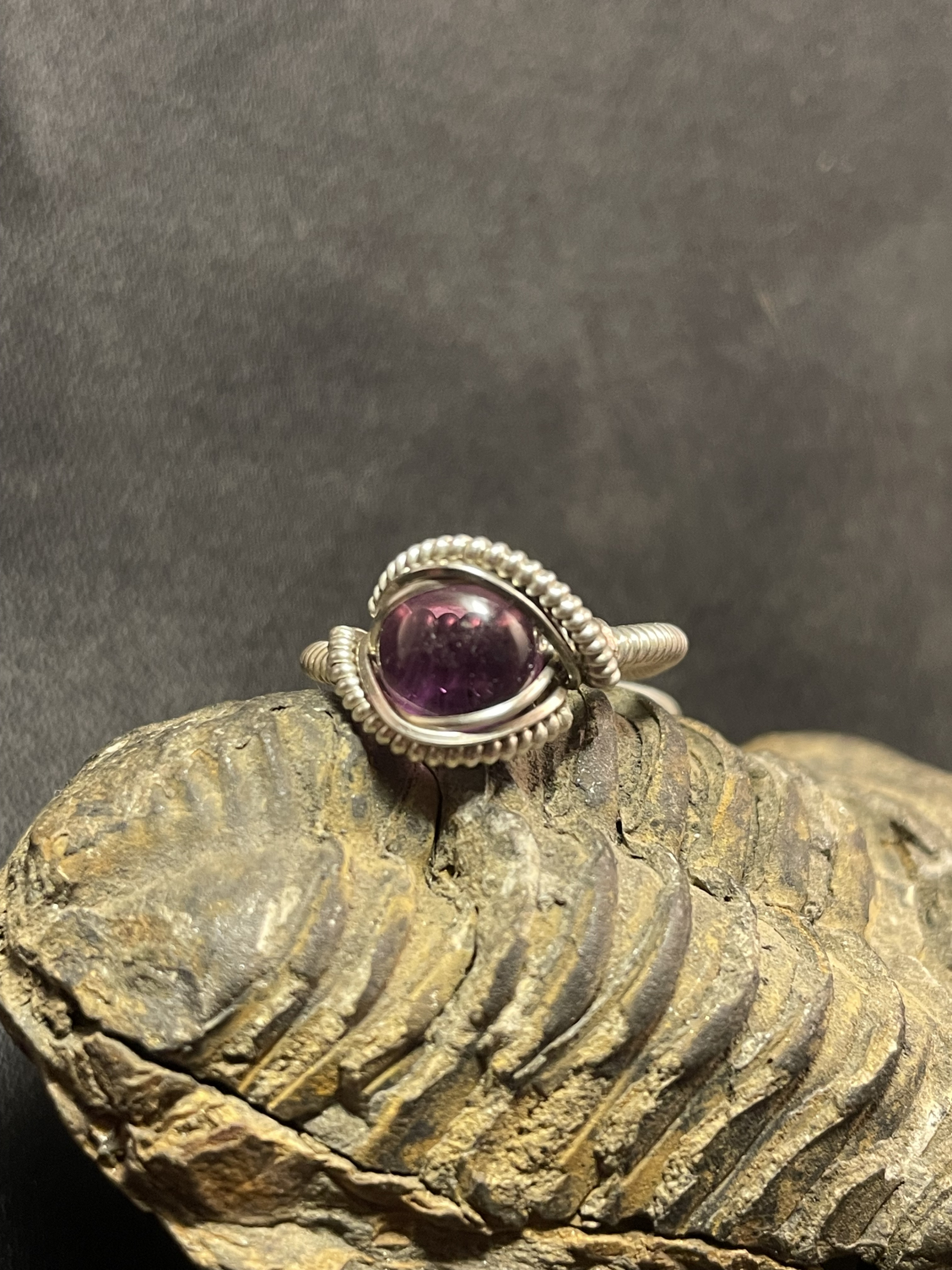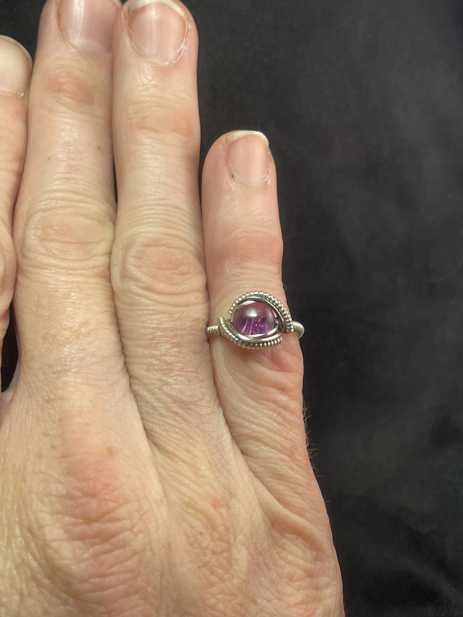 Handcrafted .925 Sterling Silver wire featuring a purple Amethyst cabochon that almost looks like it's glowing in the light