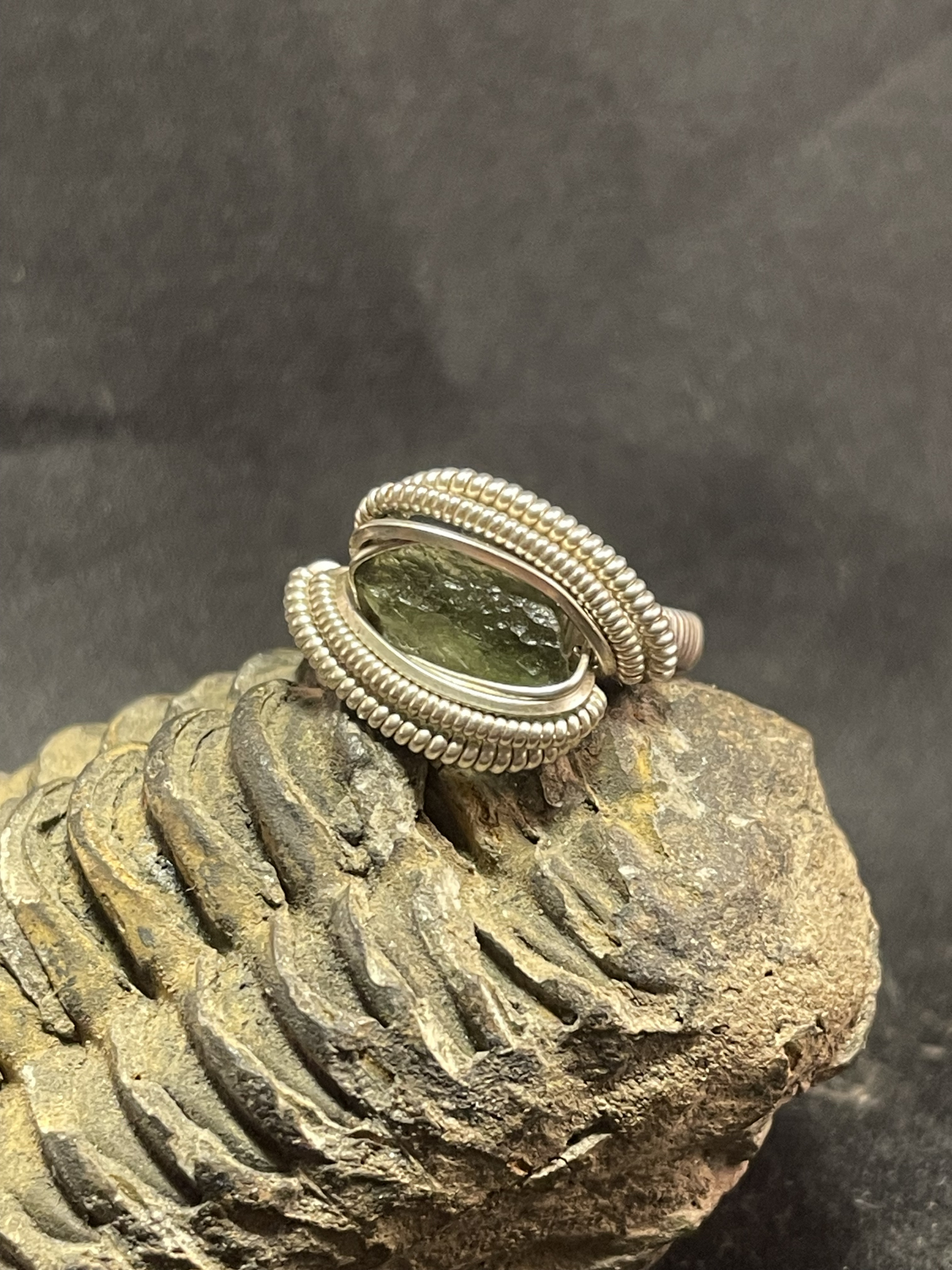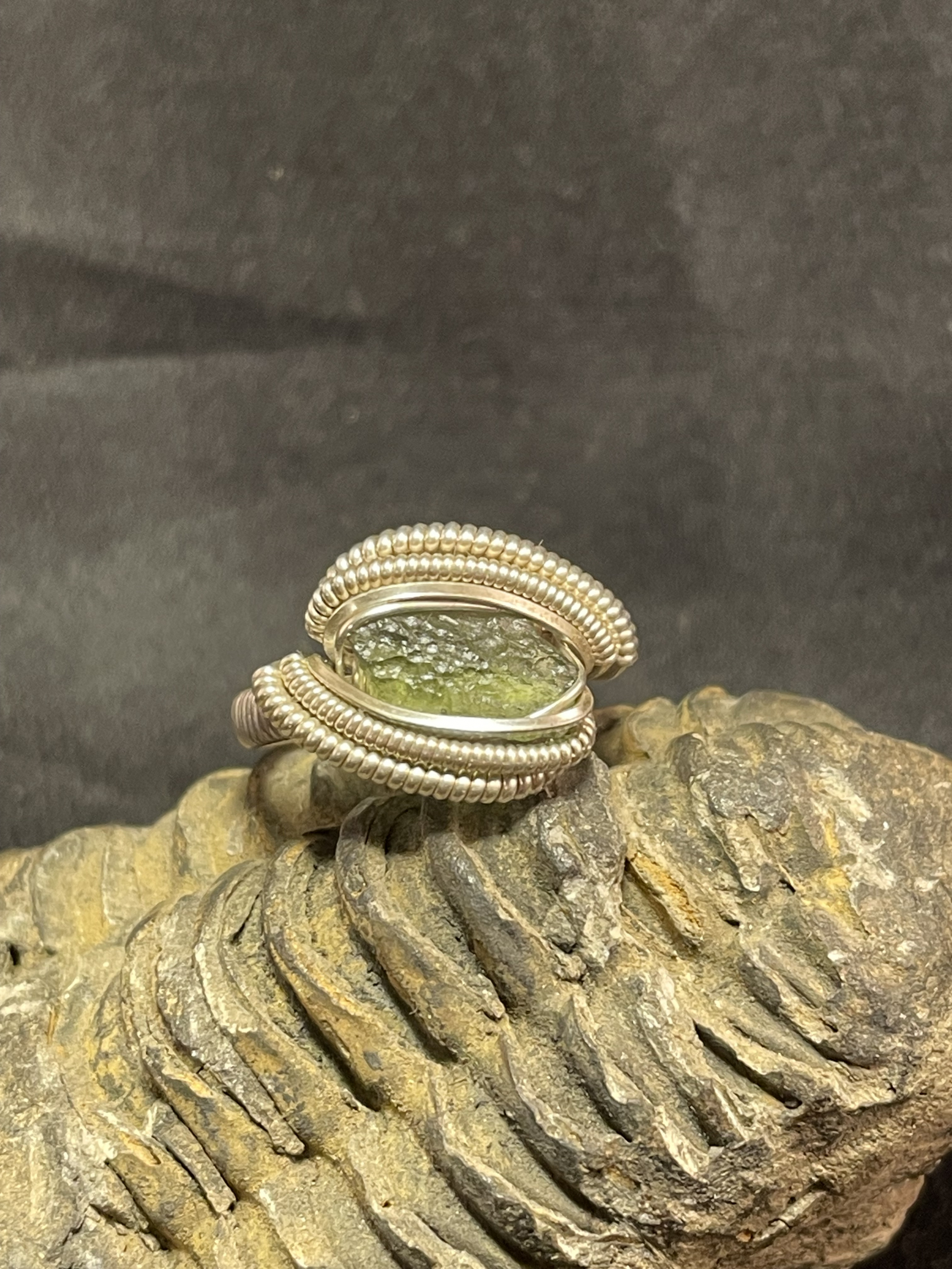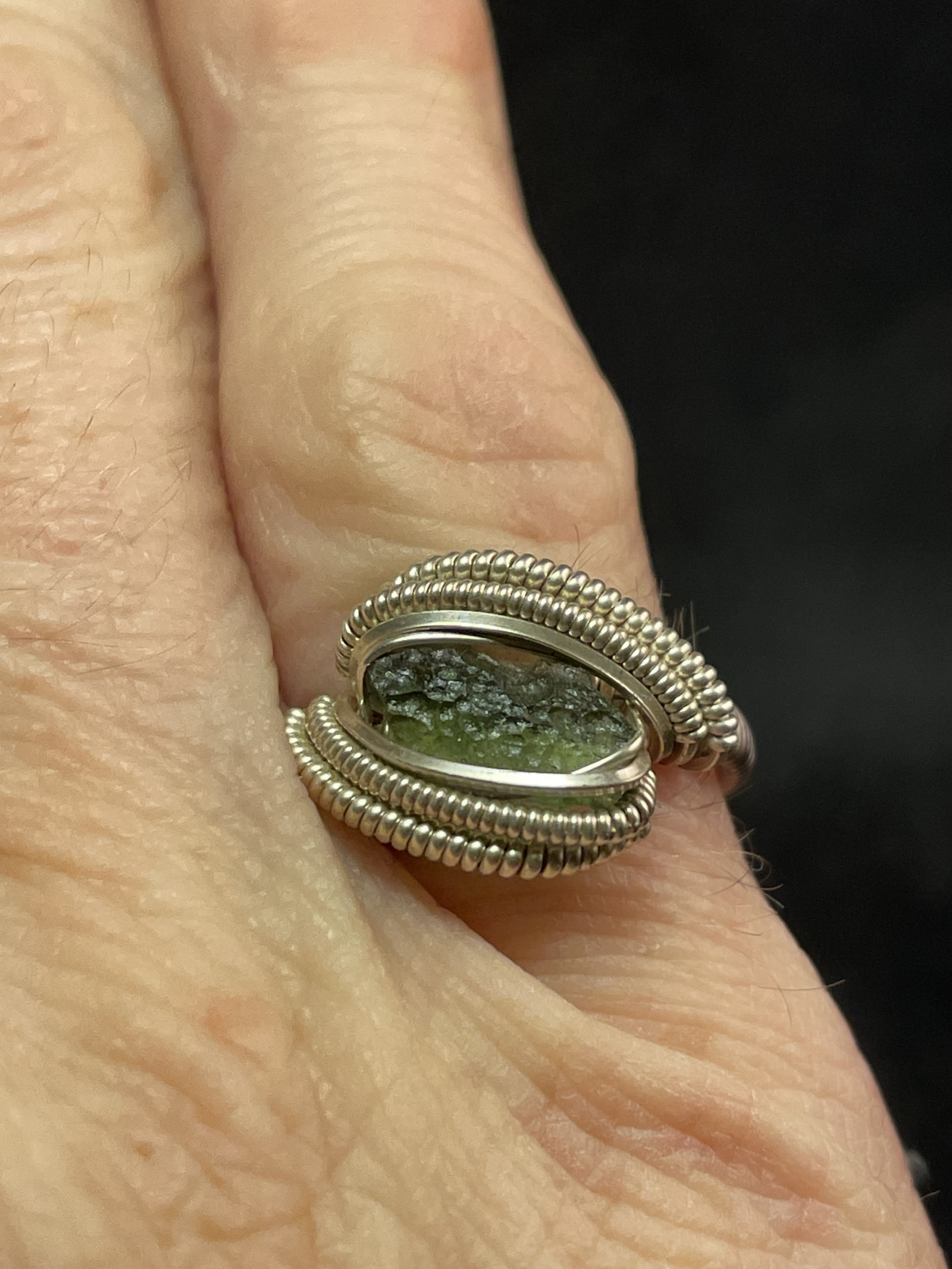 Handcrafted .925 Sterling Silver wire featuring a glorious green Moldavite space glass